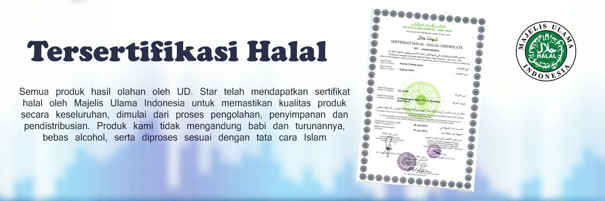 Semua produk hasil olahan oleh UD. Star telah mendapatkan sertifikat halal oleh Majelis Ulama Indonesia untuk memastikan kualitas produk secara keseluruhan, dimulai dari proses pengolahan, penyimpanan dan pendistribusian. Produk kami tidak mengandung babi dan turunannya, bebas alcohol, serta diproses sesuai dengan tata cara Islam.